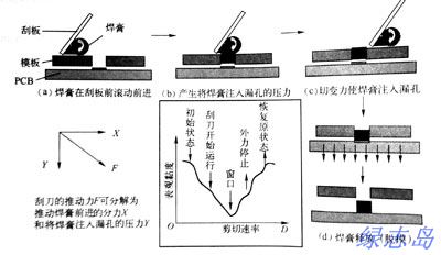 當刮刀以一定速度和角度向前移動時,對焊錫膏產生一定的壓力,推動焊錫膏在刮板前滾動,產生將焊錫膏注入網孔(即模板開口)所需的壓力,焊錫膏的粘性摩擦力使焊錫膏在刮板與網板交接出產生切變,切變力使焊錫膏的粘性下降,從而順利地注入網孔;當刮板離開模板開口時,焊錫膏的粘度迅速回復到原始狀態。下圖為焊錫膏印刷原理示意圖: