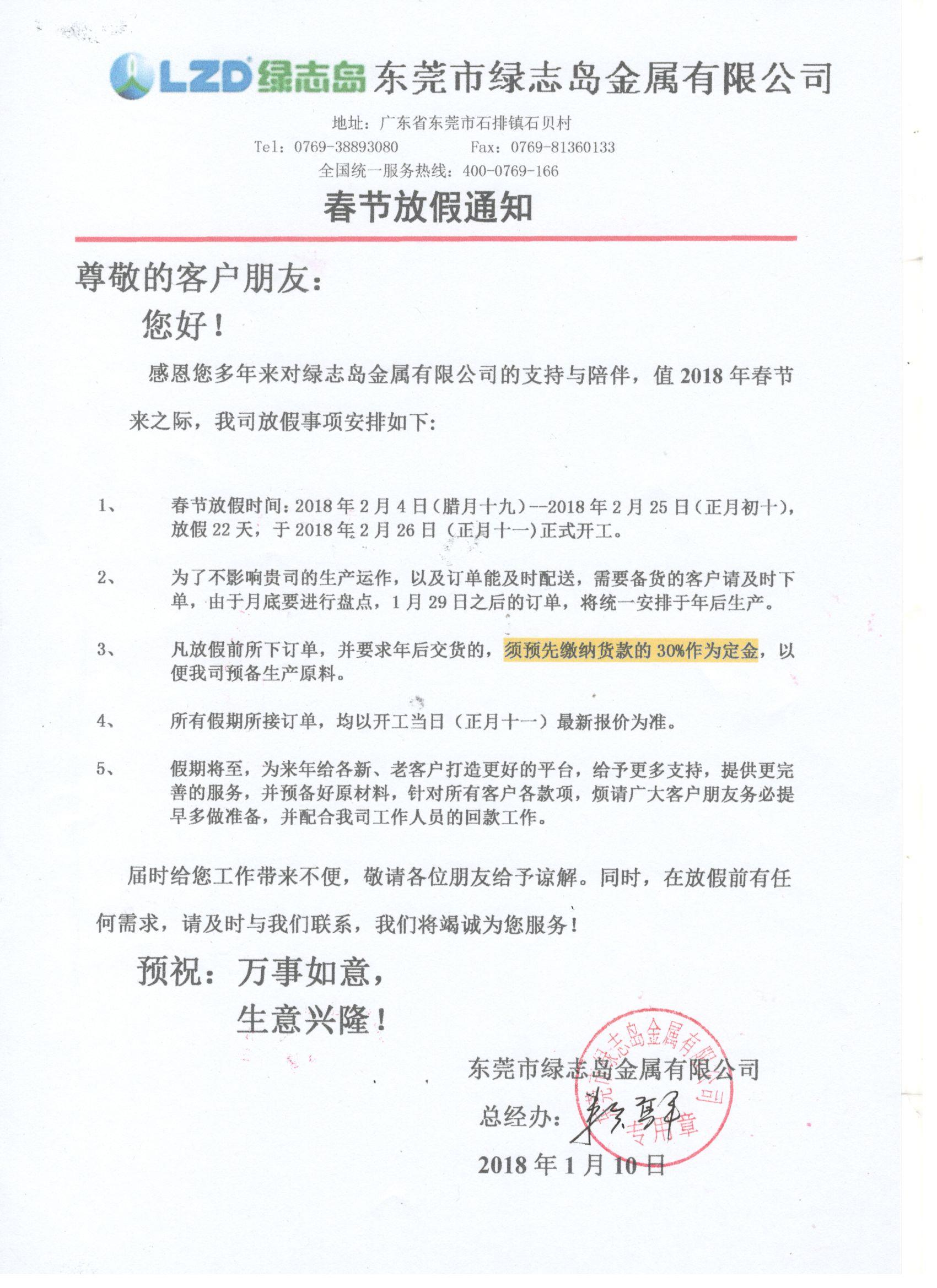 綠志島2018年春節放假通知