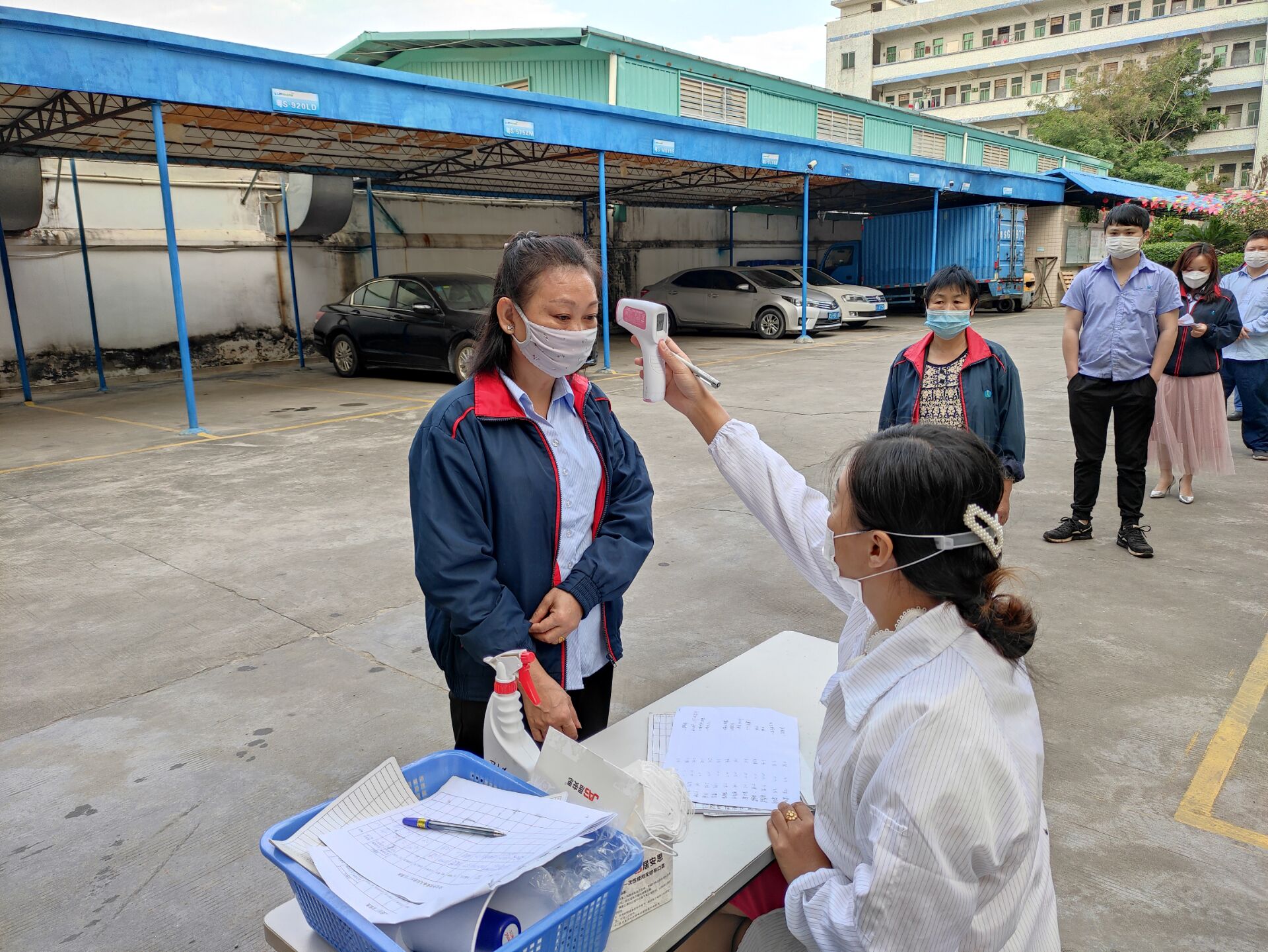▲每天早上盧經(jīng)理給每位上崗人員量測體溫